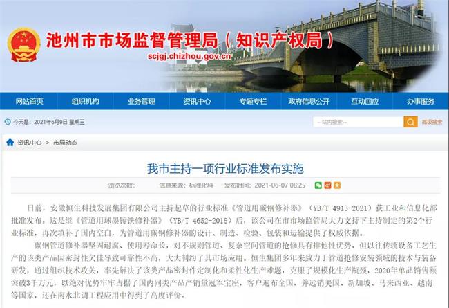 恒生集團始終堅持用標(biāo)準和創(chuàng)新持續(xù)引領(lǐng)行業(yè)發(fā)展,日前,由恒生集團主持起草的行業(yè)標(biāo)準《管道用碳鋼修補器》(YB/T 4913-2021)獲工業(yè)和信息化部批準發(fā)布。這是繼《管道用球墨鑄鐵修補器》(YB/T 4652-2018)后,恒生集團主持制定的第2個行業(yè)標(biāo)準,再次填補了國內(nèi)空白,為管道用碳鋼修補器的設(shè)計、制造、檢驗、包裝和運輸提供了權(quán)威依據(jù)。