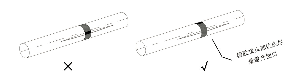 2、清理管道,保障安裝位置平整清潔,將串聯(lián)器內(nèi)外表面涂潤滑劑(食用油、洗潔精等均可)將串聯(lián)器包裹在步驟1畫出的位置上。注意事項:如下圖所示,串聯(lián)器的橡膠結(jié)合面應(yīng)朝上,同時也應(yīng)避開管道破損位置。