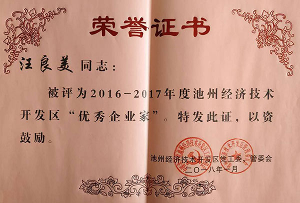 2018年1月31日, 池州市經(jīng)濟技術(shù)開發(fā)區(qū)召開了2018年度工作會議, 會議表彰了2017年度開發(fā)區(qū)優(yōu)良企業(yè)(項目)和優(yōu)良企業(yè)家,恒生集團繼榮獲“突出進步獎后又”榮獲“創(chuàng)新發(fā)展獎”,汪良美董事長再次被評為2017年度“優(yōu)秀企業(yè)家”。
